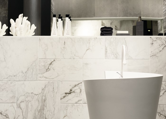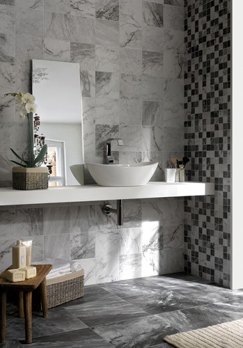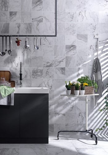 Appian Stones is an upscale Italian porcelain tile series that showcases the beautiful veining patterns of four elegant Italian marble stone looks in a consistent white or black color tone. Blending the look of Carrara Marble, Statuario Marble, Gioia Marble, and Venatino Marble, the series offers a singular, hard-to-copy expression of upscale Italian marble design for your room. Versatility is achieved with multiple porcelain tile sizes and a stunning collection of marble stone look mosaics.