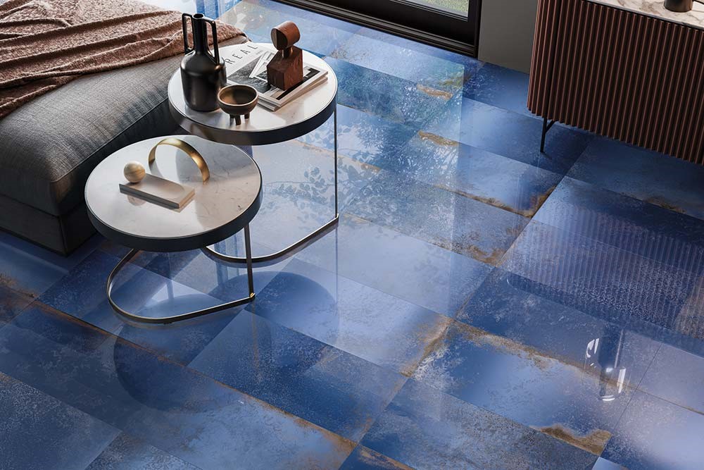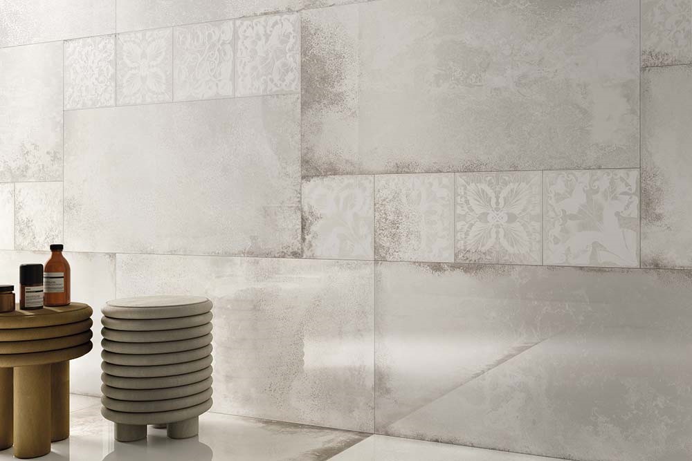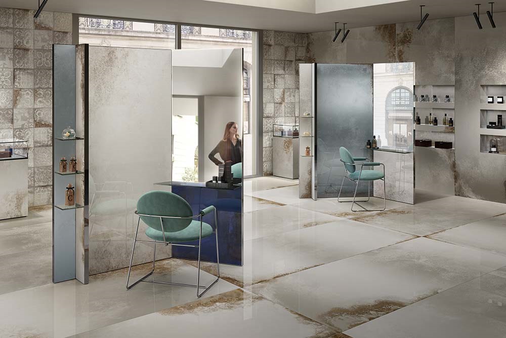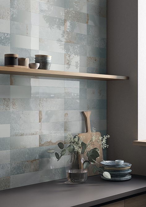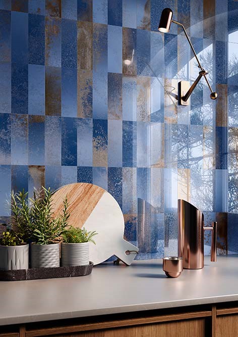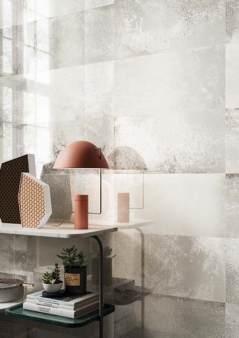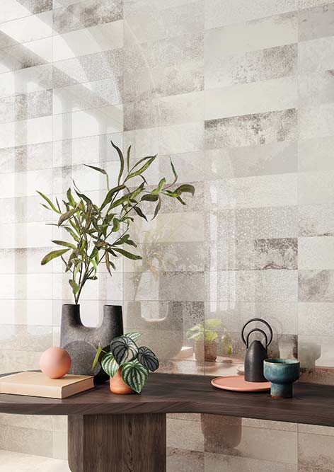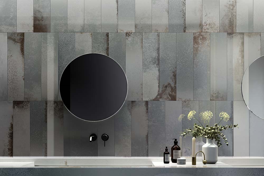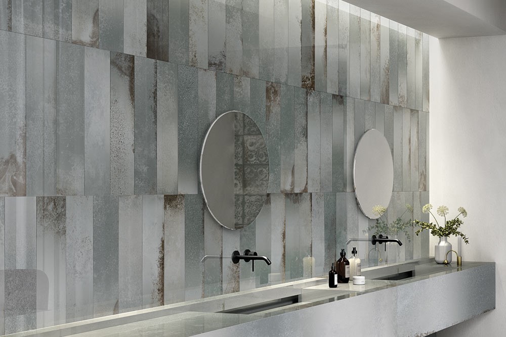 Reflections is a glazed Italian porcelain tile that imitates antiqued mirror glass tiles, alongside transformative contemporary tile effects such as oxidization. The series comes in 4" x 12" and 12” x 24” rectangular tile formats in both polished tile and matte tile finishes. A 2” x 2” mesh-mounted mosaic tile is also available. Reflections porcelain tile offers four bold colorways: White (Perla), Grey (Argento), Cobalt Blue (Zaffiro) and Aqua Green (Topazio). Reflections Perla and Argento are rated PEI 5 for all Residential and Commercial applications. Zaffiro and Topazio are rated PEI 4 for all Residential and Light Commercial applications. With Reflections, your room presents a striking visual impact with a tactile effect – you will want to touch the tile to get a sense of its depth!