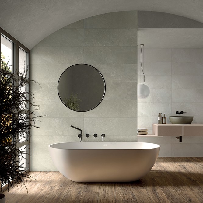Calgary porcelain is an Italian rectified porcelain tile series that elegantly expands the slate tile look in our collection. A modern design aesthetic emphasizes monochromatic colorways, subtle clefting, very light veining and intriguing surface movement. All sizes and mosaics come in White, Beige, Dark (charcoal), Grey and Emerald. A simple yet versatile line, Calgary White is suitable for all Residential and Commercial applications, while Beige, Gris and Emerald are suitable for all Residential and most Commercial applications. Calgary Dark is suitable for all Residential applications. We recommend a minimum grout joint of at least 1/8” for rectified tiles.
