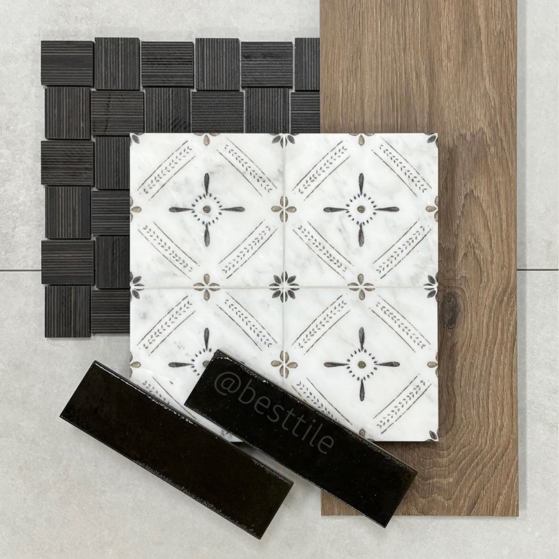 To enhance Sealskin, select tiles that create visual balance. Calgary White porcelain floor tile introduces a crisp, clean hue with subtle movement. The lighter color of Calgary adds a soft touch, preventing the space from feeling too heavy. For another complementary detail, consider adding the StoneImpressions Mila Hammertone patterned tile on a backsplash or accent wall. This stunning tile offers a charming brown-grey pattern on bright white marble, providing a playful counterpoint to further enhance Sealskin. A perfect alternative to use in place of paint is our Craft Carbon ceramic wall tile. These glossy wall tiles capture Sealskin's defining character effortlessly.